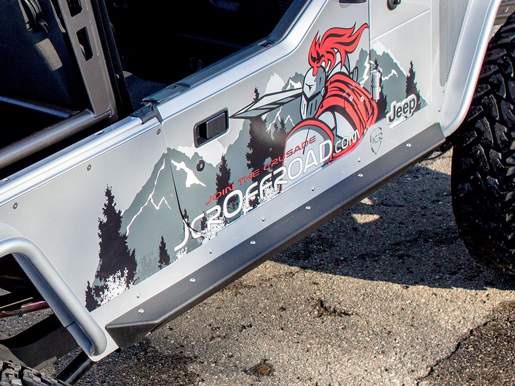 Wrangler Rock Sliders - TJ Crusader. Jcr Offroad's Crusader Rock Sliders are designed as a mini boat side style slider that is stronger and provides higher ground clearance than the traditional angle steel tube slider. The two piece design allows for easy installation, and works as a convenient step on a lifted Wrangler. Steps are 3.5 inches wide.